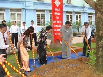 Phó Chủ tịch nước Nguyễn Thị Doan và các đồng chí lãnh đạo tỉnh, Bộ GD&ĐT trồng cây lưu niệm tại khuôn viên nhà trường.